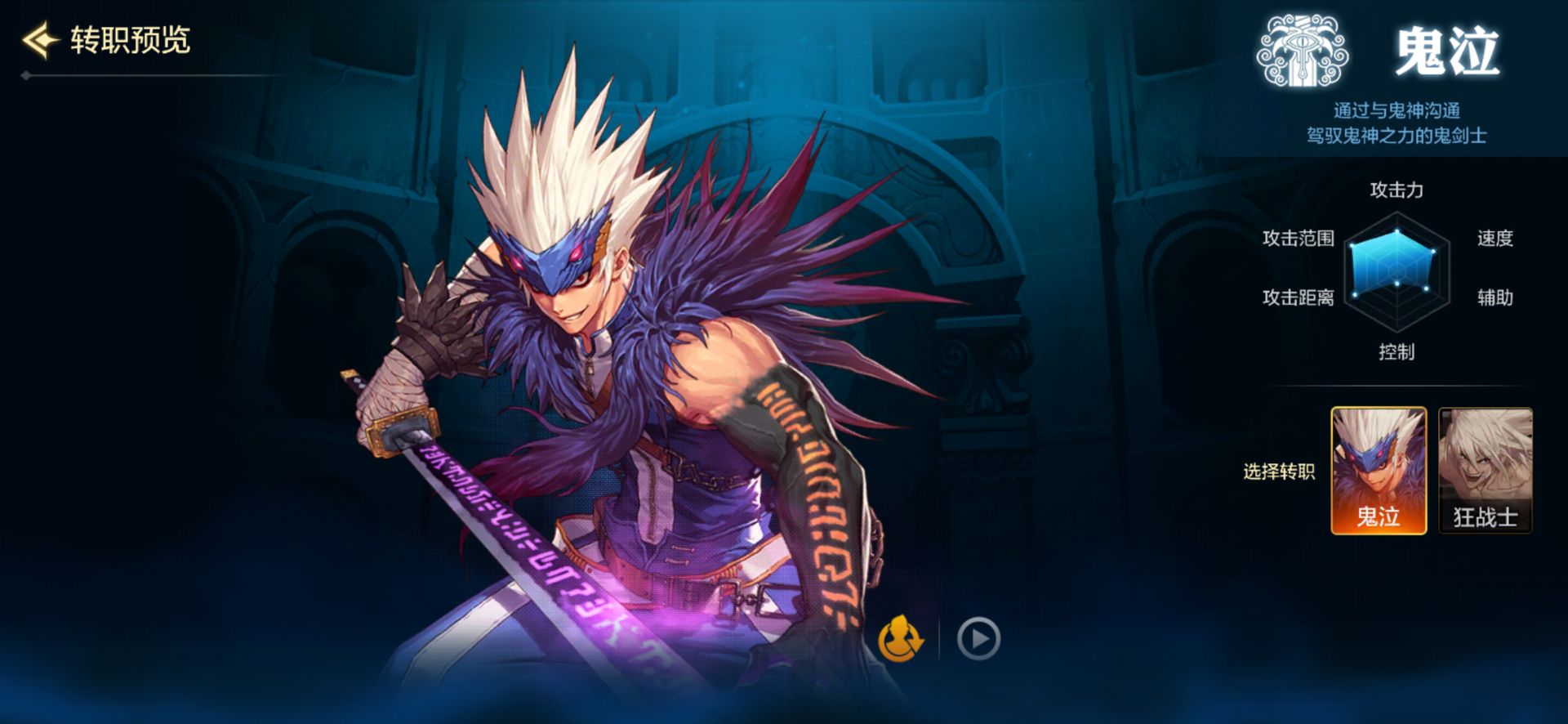 俗称小黑,身穿布甲,走路潇洒,虽手持太刀却是一个不折不扣的暗属性魔法攻击型职业,更是一直在和狂战士一较高下!鬼泣虽然定位为辅助职业,但是由于各种鬼阵的加成和对敌对的减益,无论是世界BOSS的排名还是刷图的效率皆在狂战之上!但由于BUFF技能过多且属于低防的布甲职业,需要一定的走位技巧!但是技能的高爆发能力也是不容小觑!!(对狂战的口号:你霸PK我霸图)